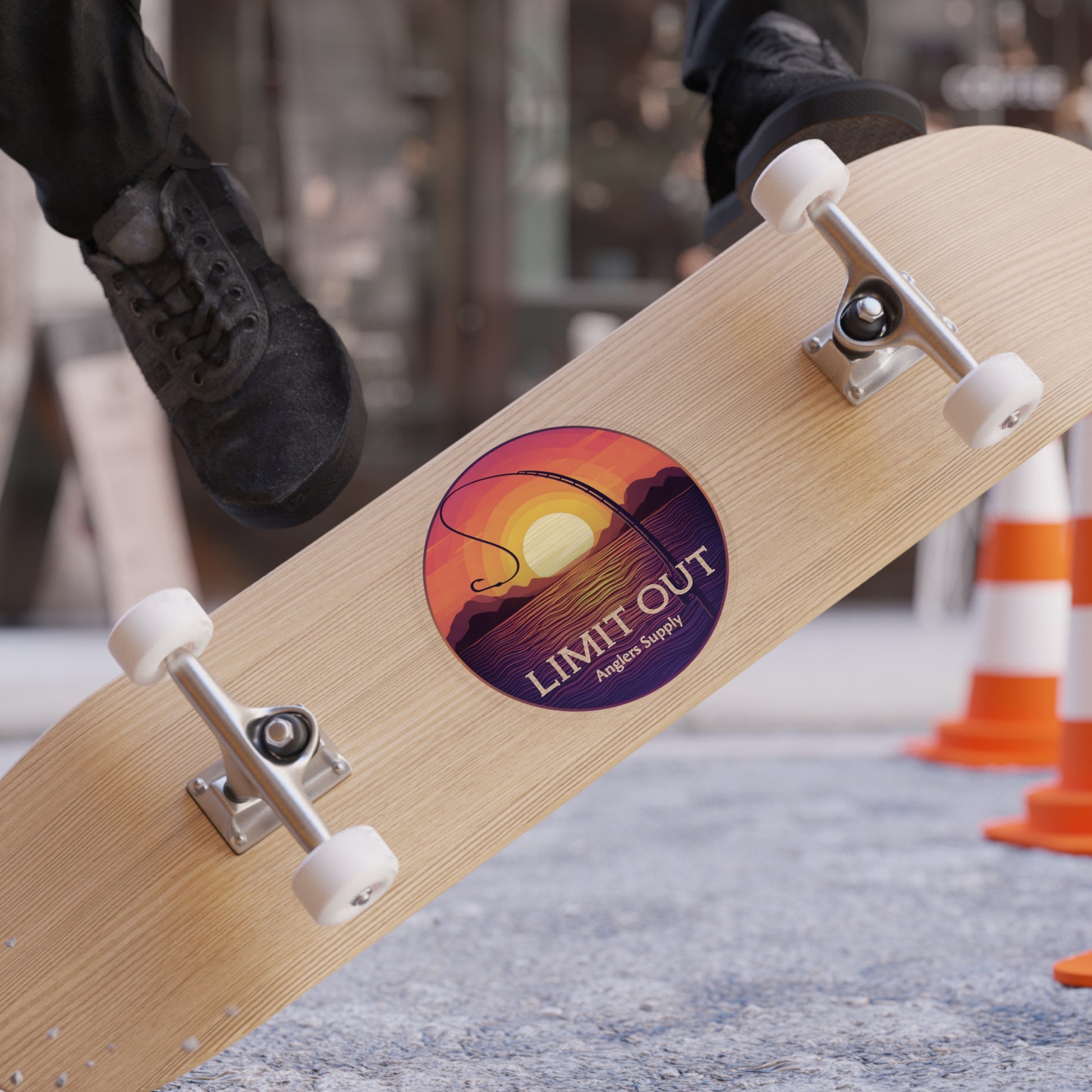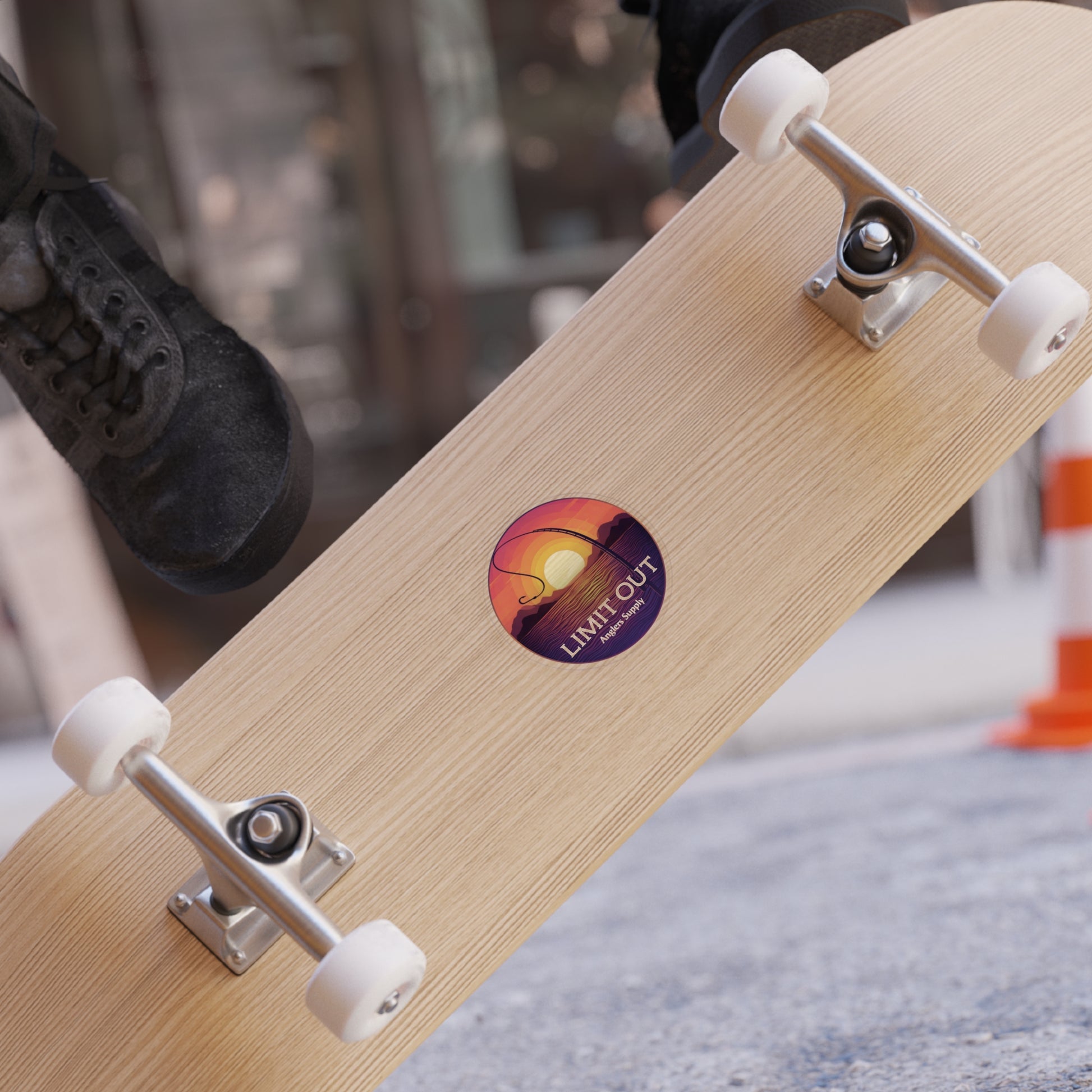 Round transparent outdoor sticker featuring a vibrant sunset over water with a looping fishing rod silhouette and bold “LIMIT OUT Anglers Supply” text. The warm gradient of orange, pink and purple pops against the clear background, letting the underlying surface show through. Durable, weather-resistant vinyl with a matte UV protective laminate keeps colors vivid and reduces scratches and moisture damage, so the sticker wears in—never out—on boats, coolers, vehicles, and tackle boxes. The artwork captures that quiet golden-hour feeling after a long day on the water: calm waves, the rod arc in your hands, and the sun sliding into the horizon. It’s designed to blend seamlessly with outdoor gear, adding a subtle, outdoorsy signature that anglers will recognize and wear proudly.